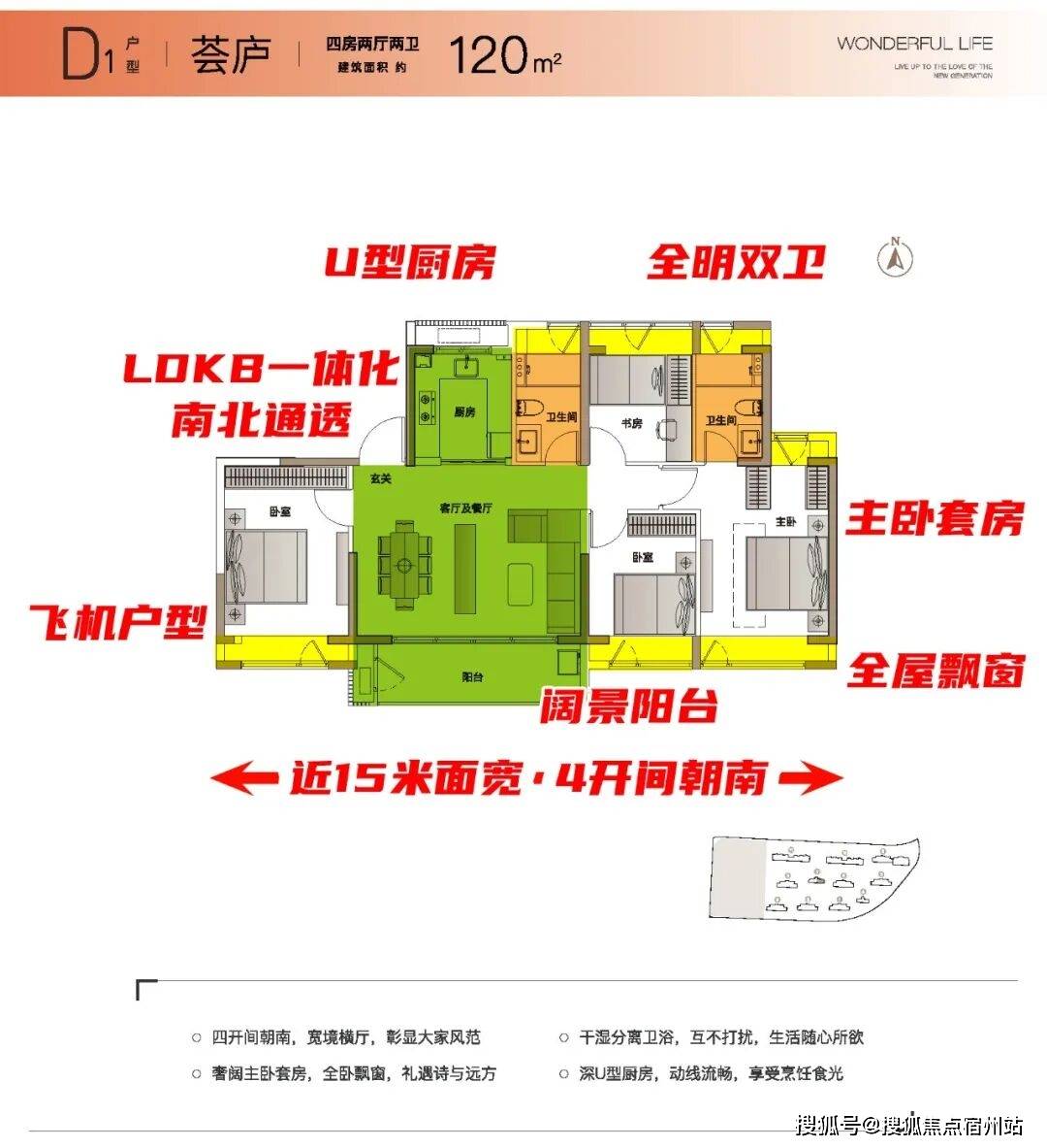 四开间朝南、宽境横厅、飞机户型、奢阔主卧套房、U型大厨房、全卧飘窗等亮点,满足多孩家庭或改善型客户对空间与品质的双重期待。